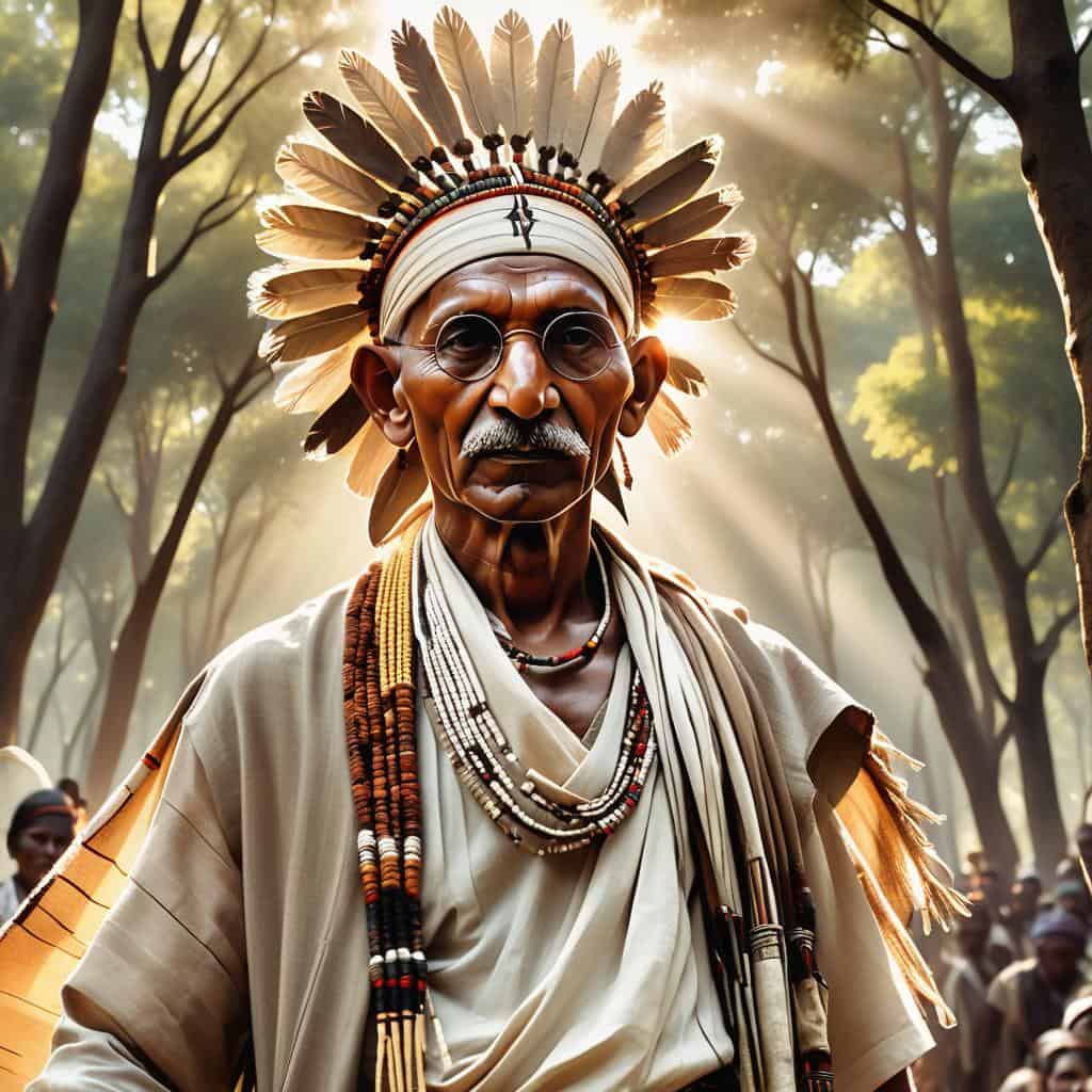 Gandhi as an Indigenous tribal leader, draped in traditional garments, with a calm and determined expression, guiding his people on a march for freedom. #ReimaginedHistories