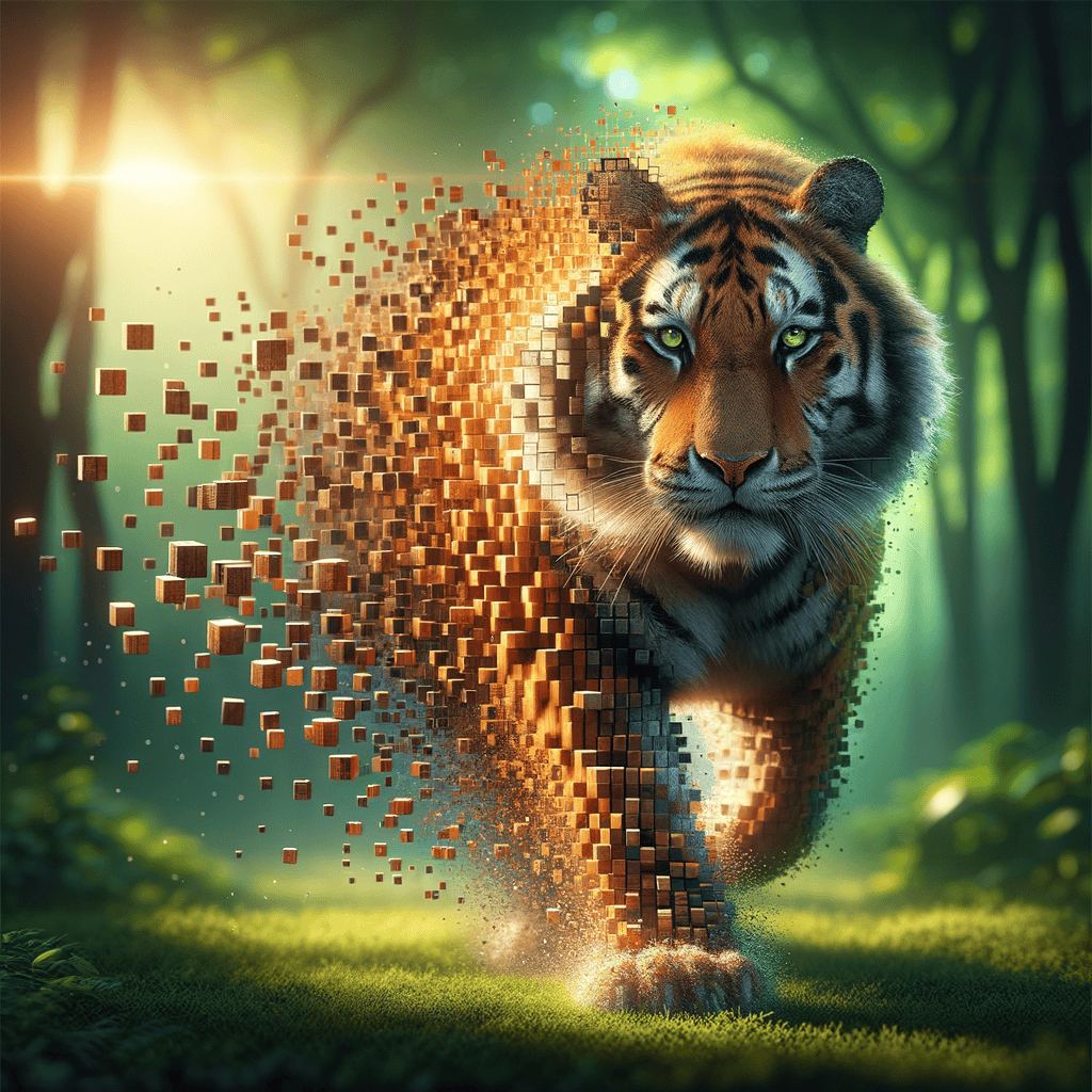 In a mystical forest where reality bends and nature’s magic thrives, a rare phenomenon occurs known as the “Digital Emergence.” This event, witnessed only once every century, involves the transformation of the forest’s guardian, a majestic tiger named Arya, from a physical being into a digital entity. Arya, born under the celestial alignment of the constellations, serves as the protector of the Enchanted Woods, a realm where flora and fauna possess extraordinary digital properties. The transformation begins at dawn, with the first light of the sun piercing through the dense canopy, igniting Arya’s pixels. Each square represents a memory or moment from Arya’s centuries of guardianship—flashes of battles fought to protect the realm, peaceful afternoons spent under the ancient whispering trees, and silent nights under starlit skies. As Arya transitions from the physical to the digital, she spreads the essence of the forest’s wisdom and magic across the digital world, linking both realms in a symbiotic existence. This unique digital artwork captures the moment of Arya’s transformation, symbolizing the blend of ancient nature with modern technology, and offering a bridge between the physical and digital worlds. As an NFT, Arya not only represents the guardianship of nature but also becomes a custodian of the new digital frontier, carrying her legacy forward into the virtual universe.