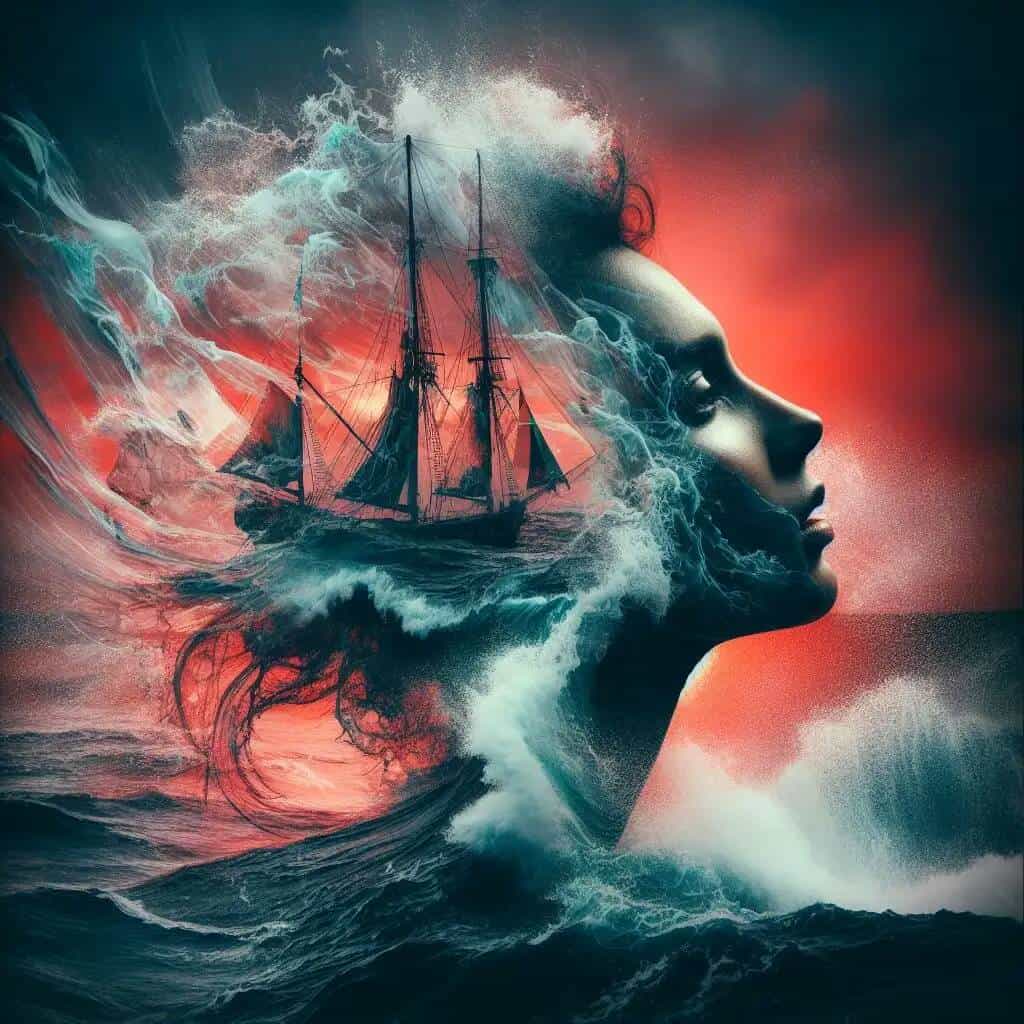 In the turbulent embrace of the open sea, where azure waves clash against scarlet horizons, a woman’s face emerges—a beacon of solace amidst the vast expanse. These images, bathed in the hues of longing and passion, depict the ebb and flow of emotions when marooned at sea. The silhouette of ships adds an air of adventure, a reminder of untold tales and the relentless pursuit of distant shores. “Siren’s Reverie” captures the essence of being lost at sea, where thoughts of her become the only constancy amid the tempestuous waters.