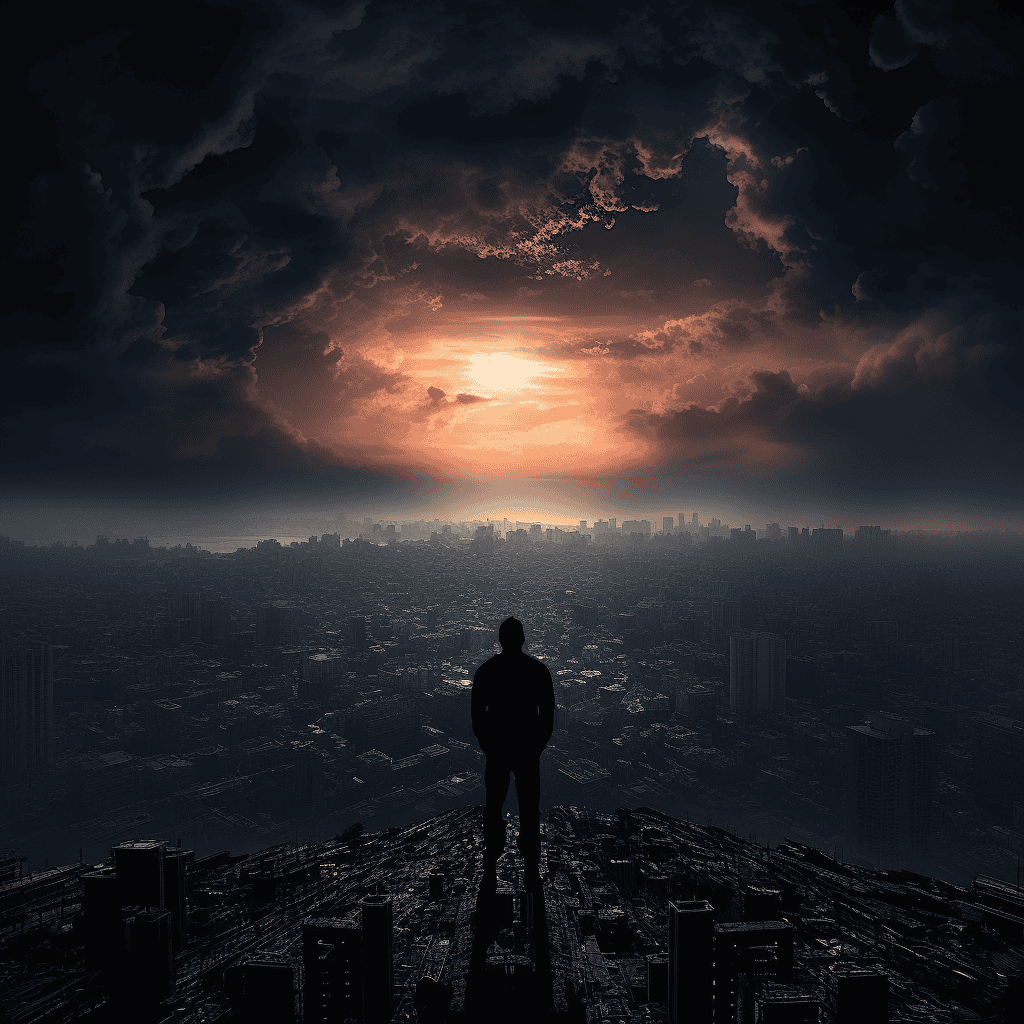In ‘Solitary Contemplation,’ a lone figure stands on a cliff, overlooking a dark cityscape. Amidst the overcast skies, a break in the clouds reveals a distant light, symbolizing hope in adversity. This image encapsulates the human spirit’s resilience and the beauty of introspection in a challenging world.